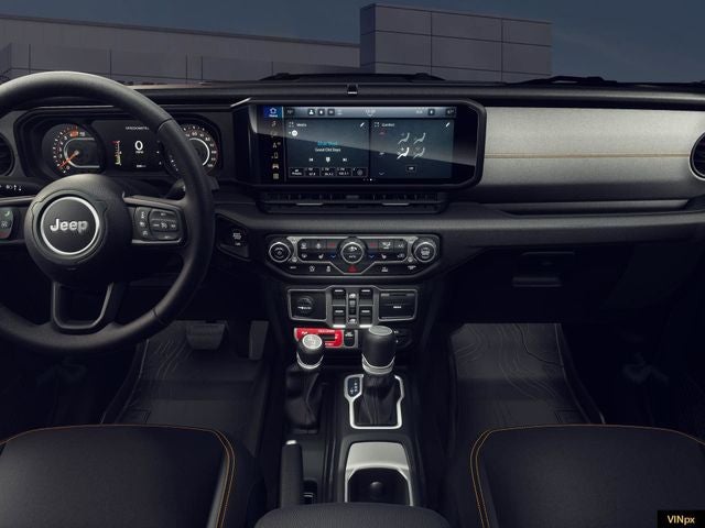 Elevating the Gladiator's off-road prowess, this Willys edition boasts a host of premium features, including heavy-duty red accent shock absorbers, an E-Locker rear axle, and the Off-Road Plus mode for exceptional trail-conquering capability. The Corning Gorilla Glass windshield and LED premium reflector headlamps ensure you'll have uncompromised visibility, while the power dome dual vented hood and body-color fender flares add a rugged, bold appearance.